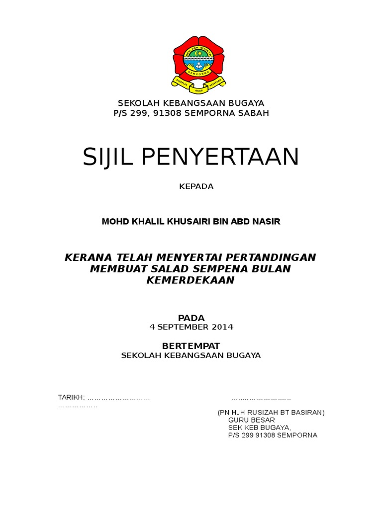 Sijil Penyertaan Dengan ini disahkan bahawa NAMA PELAJAR KP telah menyertai LARIAN MERENTAS DESA 2014 pada. Mohon untuk subscribe comment like dan share untuk video video terbaru dari kuiz studios. Contoh sijil penyertaan pertandingan mewarna.