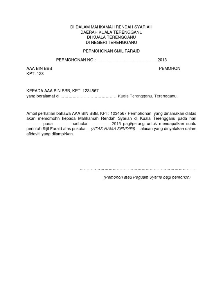 Perkara yang penting dalam sijil faraid adalah kiraan bahagian yang layak diterima oleh setiap ahli waris sebagaimana yang. Contoh Surat Faraid Iii salinan kad pengenalan waris waris sijil kelahiran atau surat akuan. Permohonan sijil faraid author.