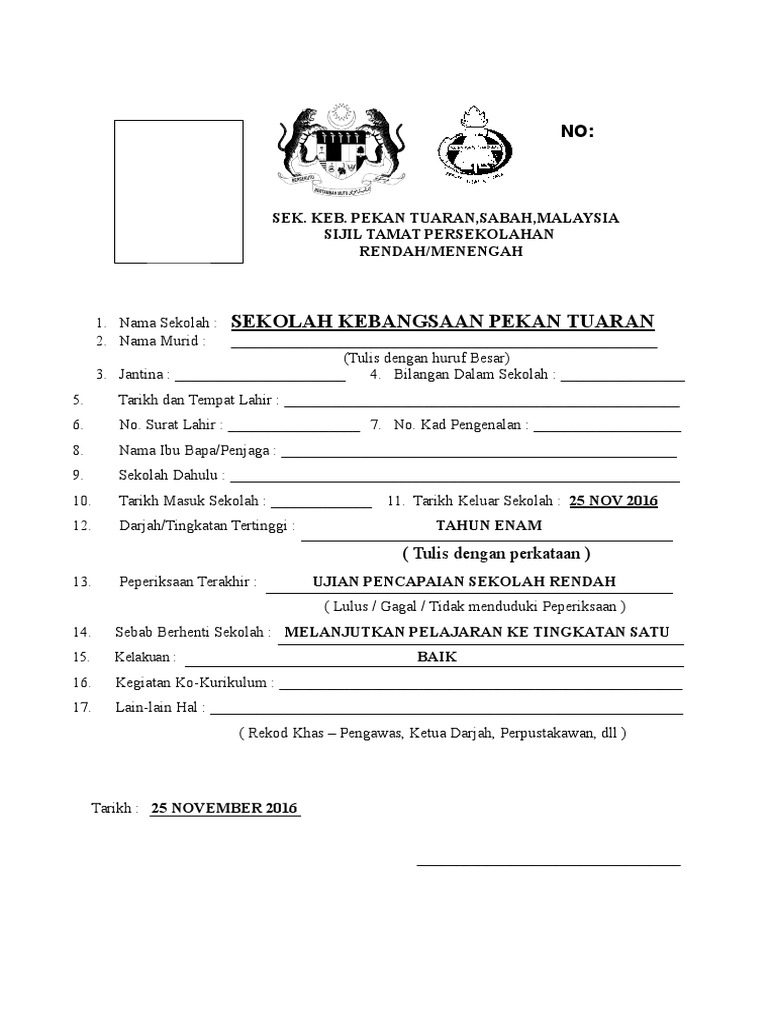 Bil Kemasukan Sekolah School Admission No. Sijil tamat sekolah rendah versi 2016. Sijil Berhenti Sekolah.