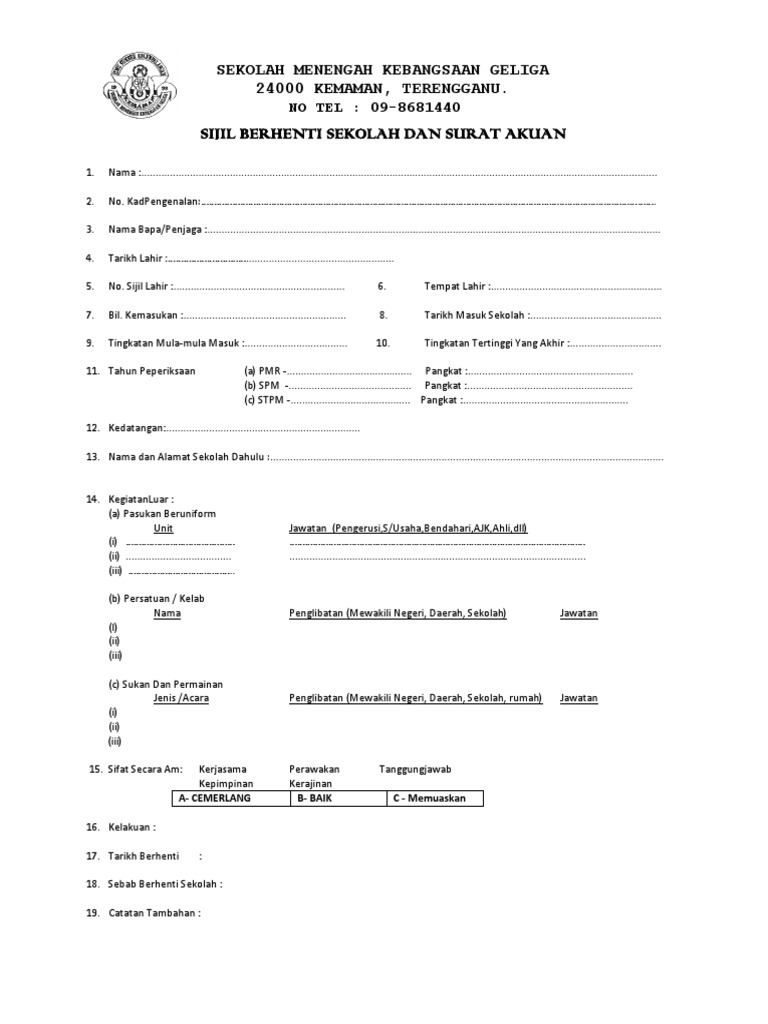 Contoh borang sijil berhenti sekolah. Dokumen-dokumen lain yang berkenaan. Borang ini hendaklah dikembalikan kepada Pengetua sekolah asal.